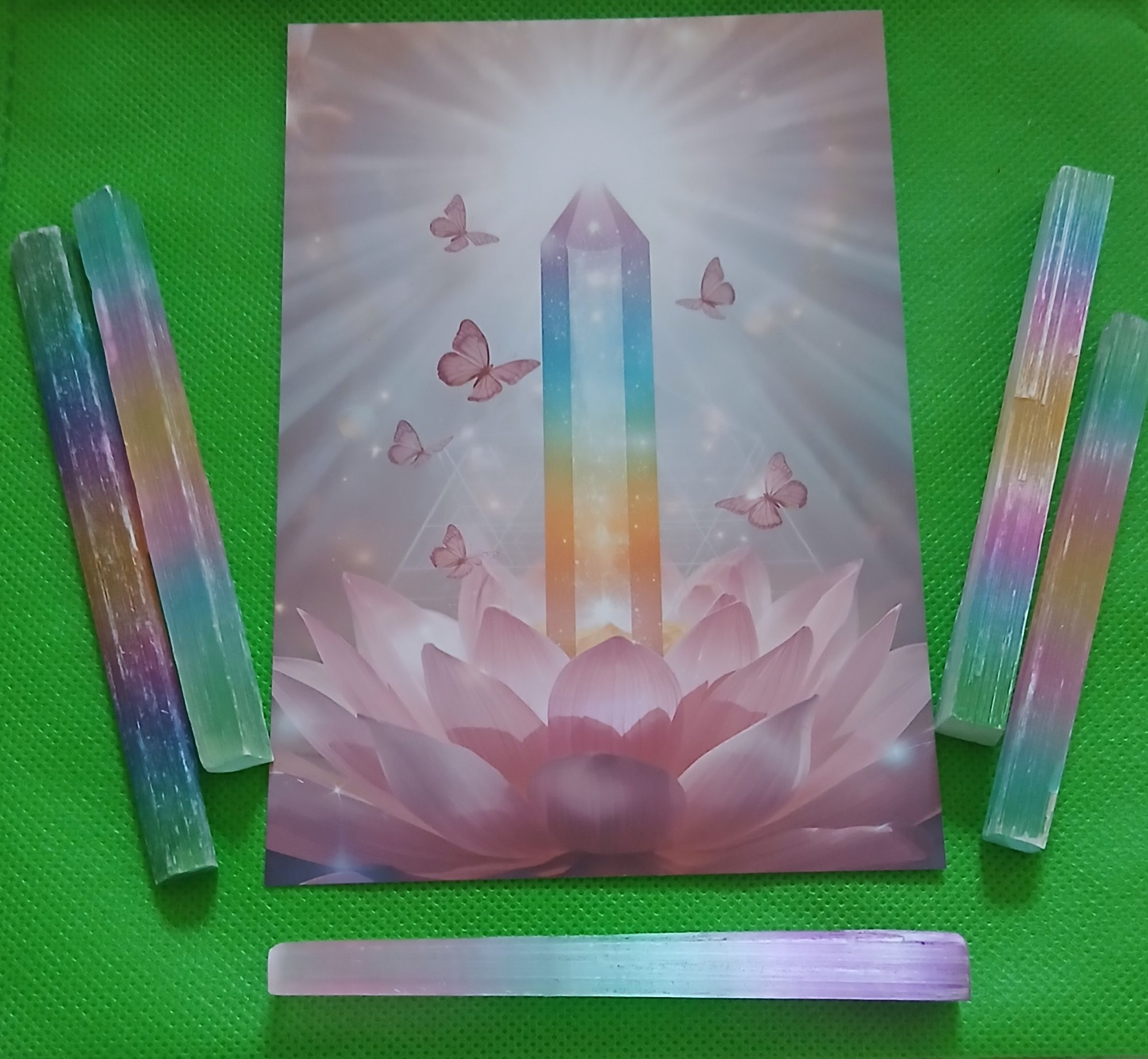 A beautiful addition to any altar, healing practice, or crystal collection—this Rainbow Aura Selenite Wand brings light, clarity, and sacred serenity into your everyday rituals.